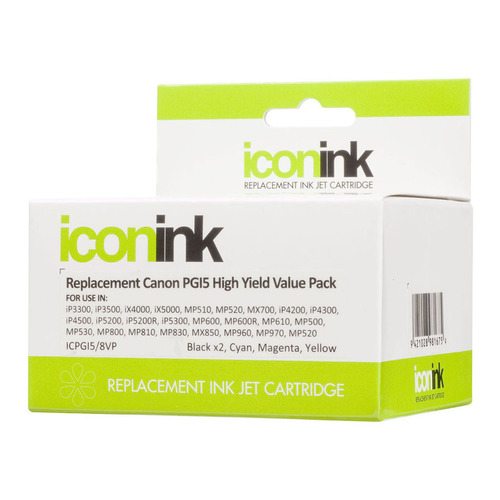 Icon Ink Cartridges are designed to give outstanding performance with your inkjet printer, from the first page to the last. They offer outstanding quality and print professional looking documents and photos at an economical value per page. Quick and simple to replace, they are a staple for any office. Value pack of 5 ink cartridges, includes PGi Black and CLi Black, Cyan, Magenta and Yellow. PGi Black cartridge prints up to 650 pages. Each CLi colour cartridge prints up to 450 pages. Compatible with Canon iP3300, iP3500, iX4000, iX5000, MP510, MP520, MX700, iP4200, iP4300, iP4500, iP5200, iP5200R, iP5300, MP600, MP600R, MP610, MP500, MP530, MP800, MP810, MP830, MX850, MP960, MP970 and MP520 inkjet printers.