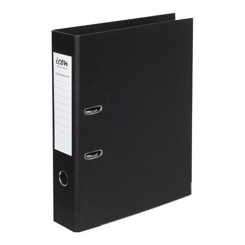 Icon Lever Arch Files are laminated with PVC to provide a durable, moisture-resistant linen-look cover. They feature a 75mm spine with large removable labelling area, metal edge protectors and ring pulls. They have a strong locking mechanism to keep pages secure and a rado fitting to allow easy closure. Foolscap size. Black colour.