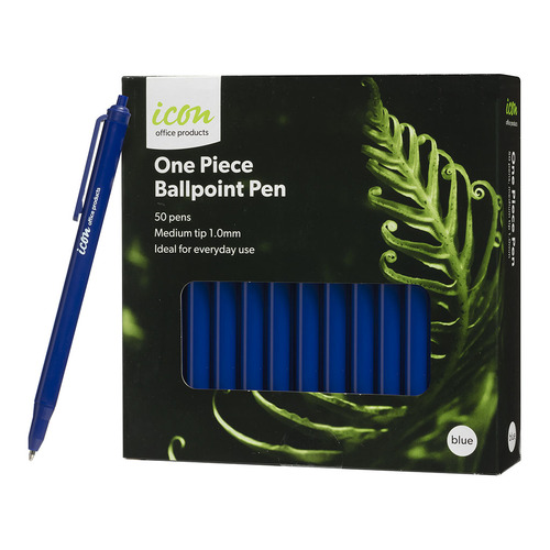 Icon One Piece Ballpoint Pens are economical pens ideal for everyday use at work, home or school. They can not be pulled or twisted apart, making them safer for children to use. They have a high quality ink that is waterproof and fadeproof. The medium tip provides smooth ink flow to avoid scratching and blotting. Blue. 1.0mm Medium tip. Pack of 50.